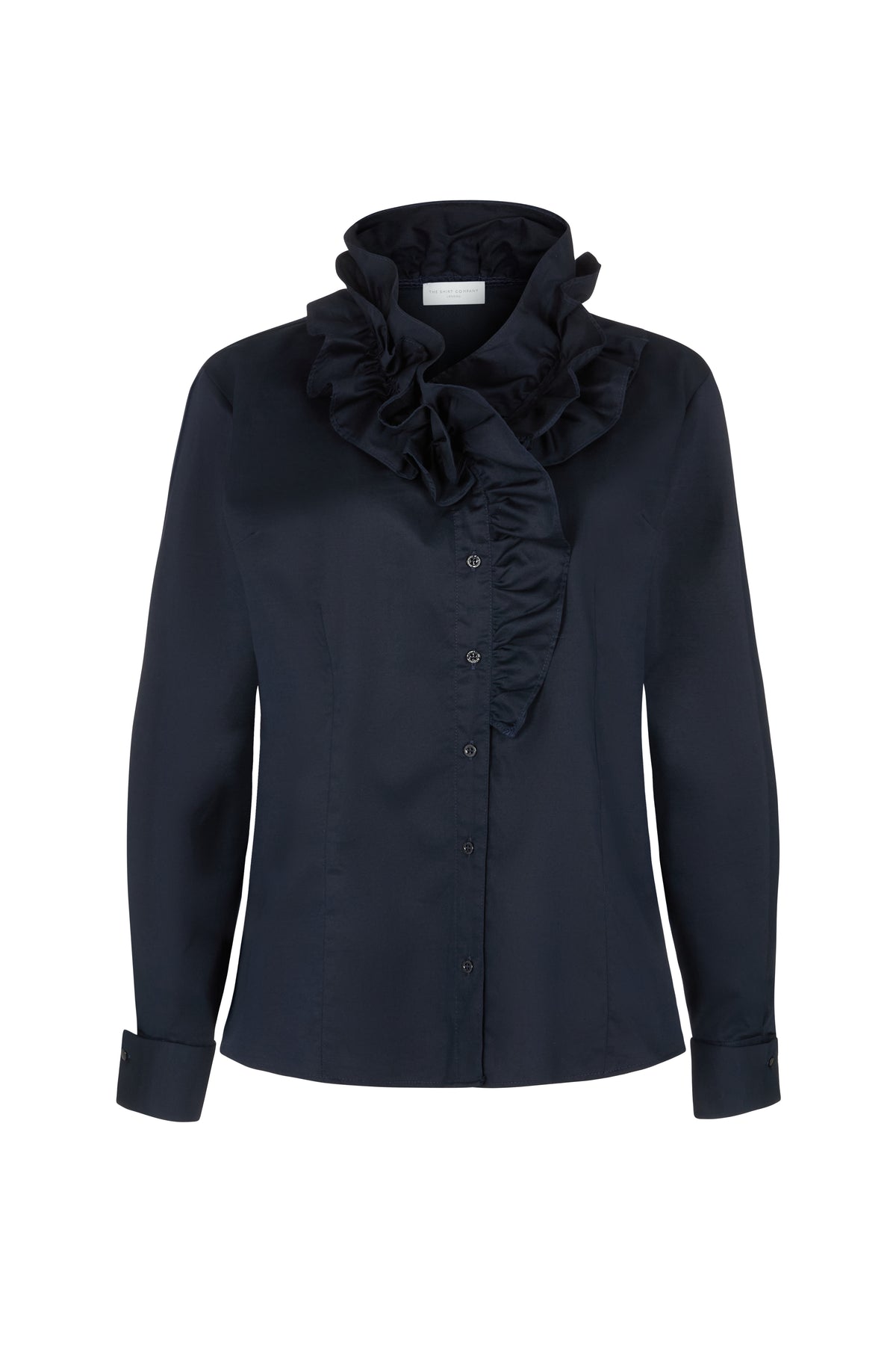 Willow Tailored Fit Ruffle Collar Double Cuff Shirt In Navy Cotton Sateen