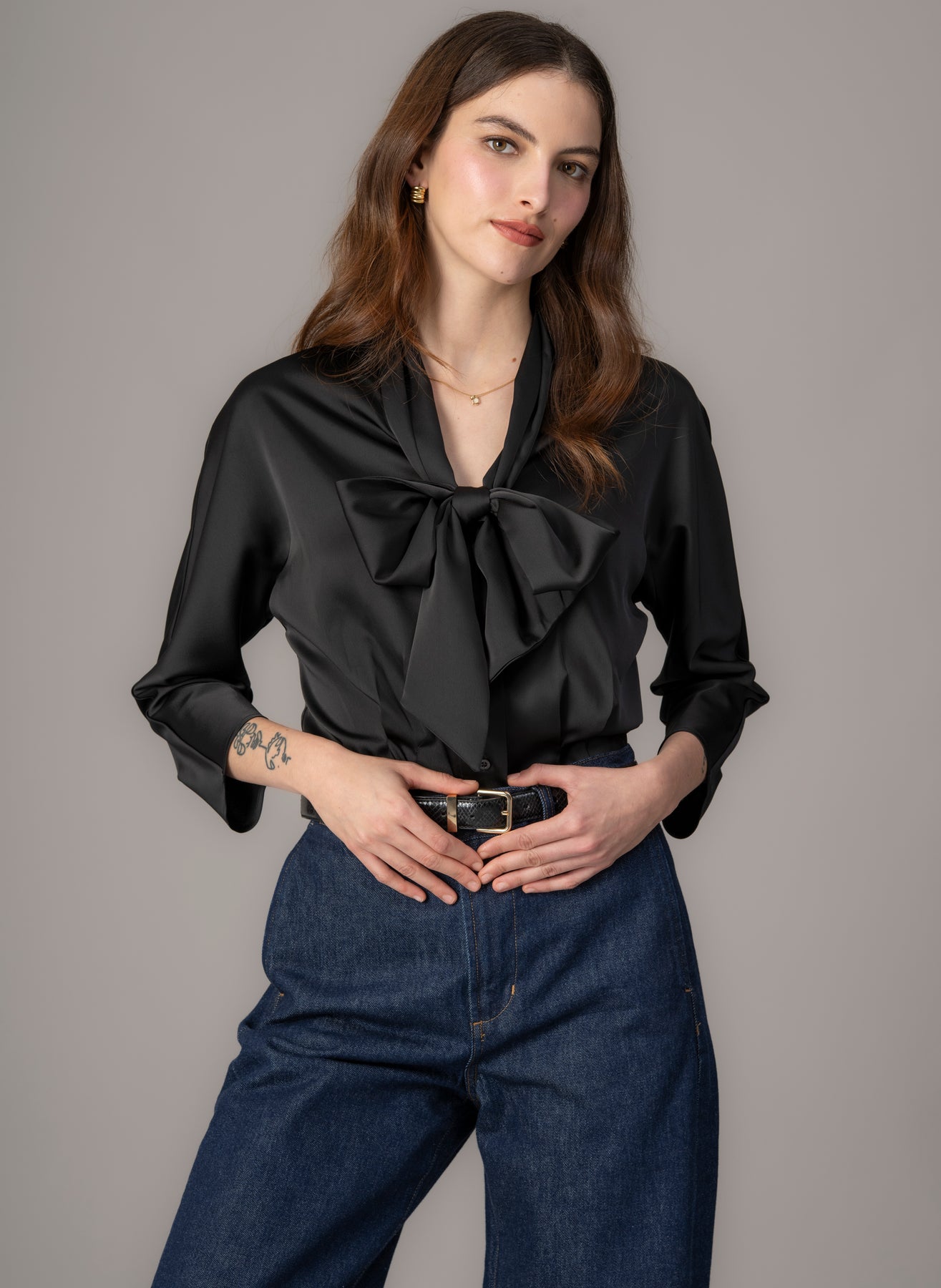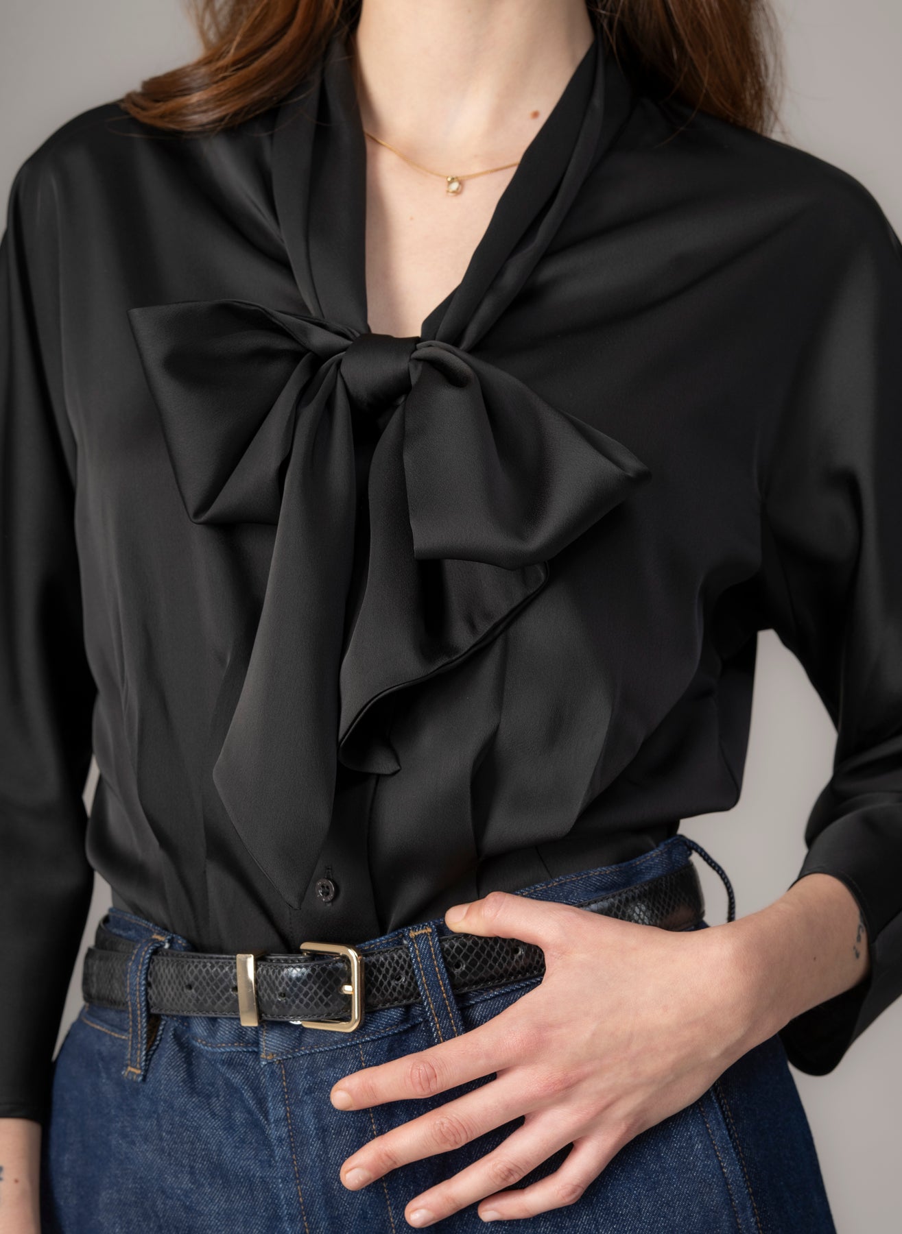 Channel timeless elegance with a playful twist. Inspired by the chic silhouettes of the 1940s, this blouse brings vintage charm into the modern day. Cut from a medium-weight, crease-resistant matte satin, its open neckline is finished with a generous pussy bow - perfectly balancing sophistication and whimsy. Soft dolman sleeves create a relaxed yet refined shape, while subtle elbow darts add comfort and movement. A joyful nod to vintage glamour, reimagined for today.