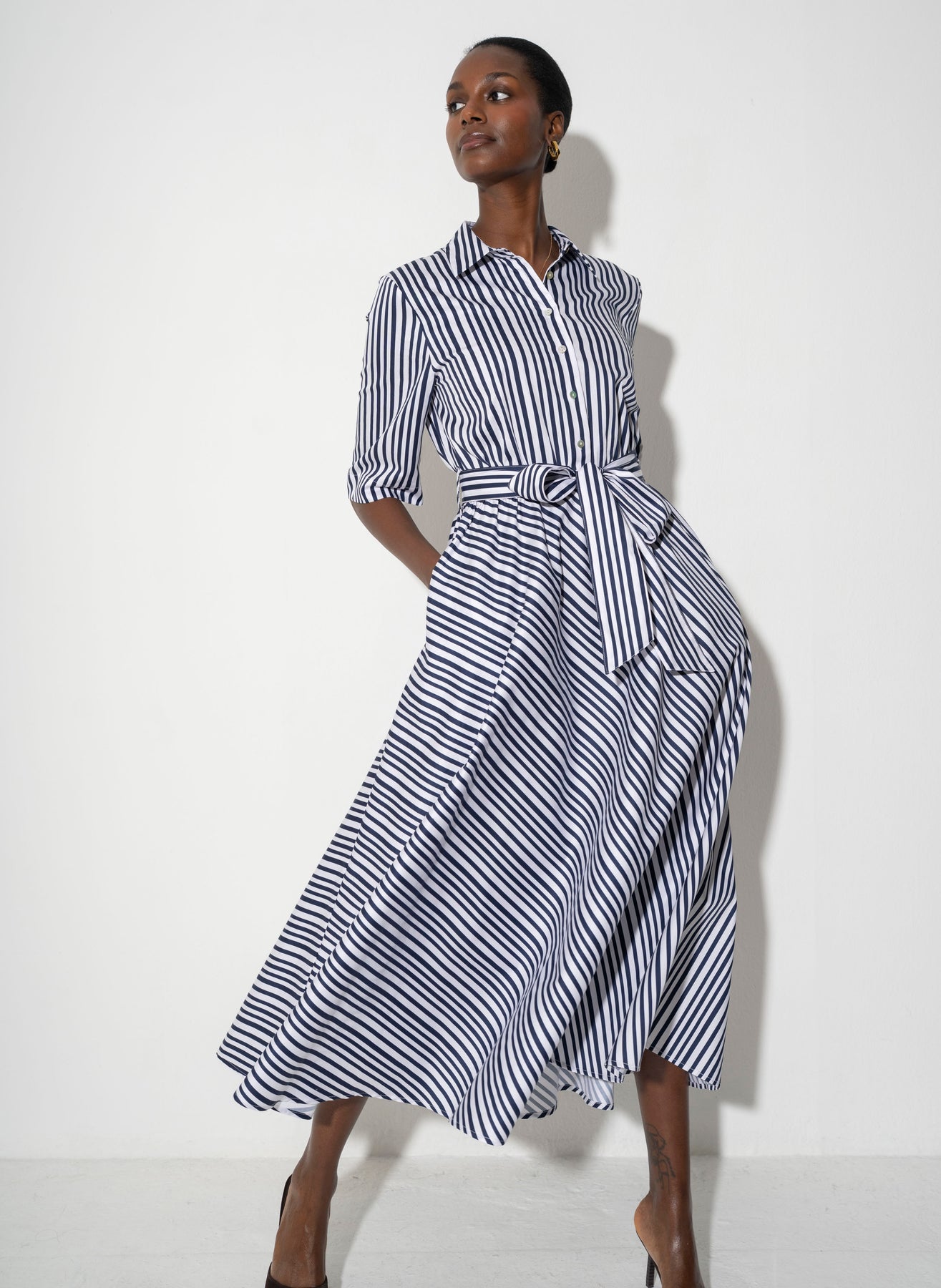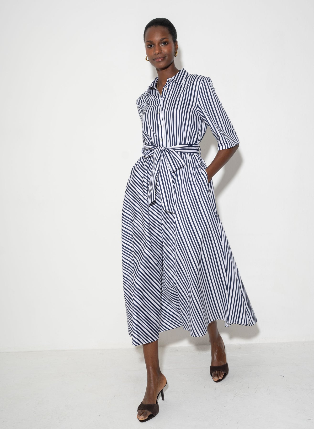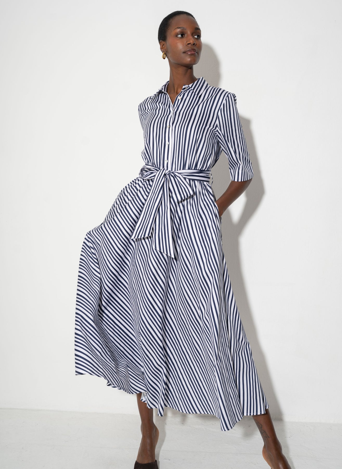 Le Marais Cotton Everyday Midi Shirt Dress in Navy Stripe