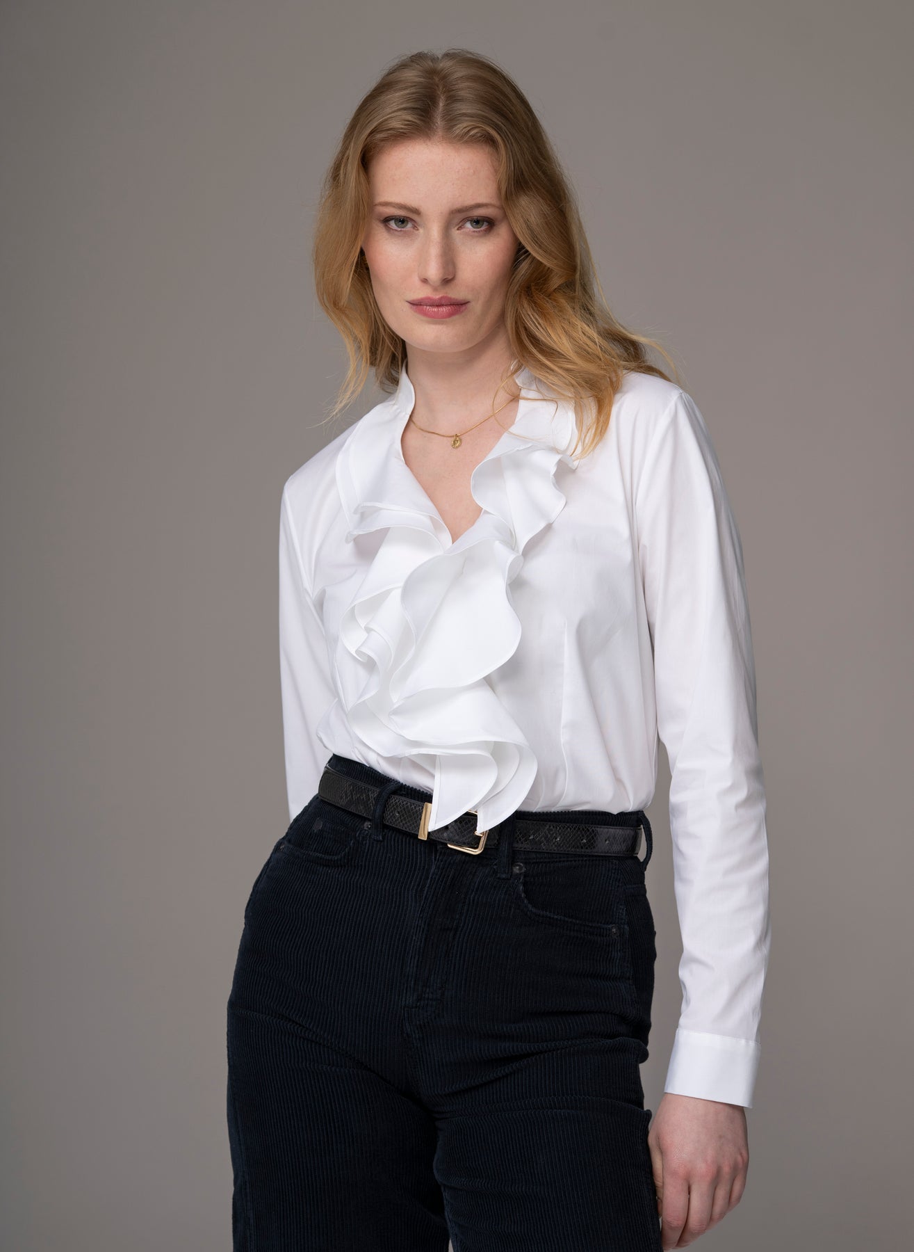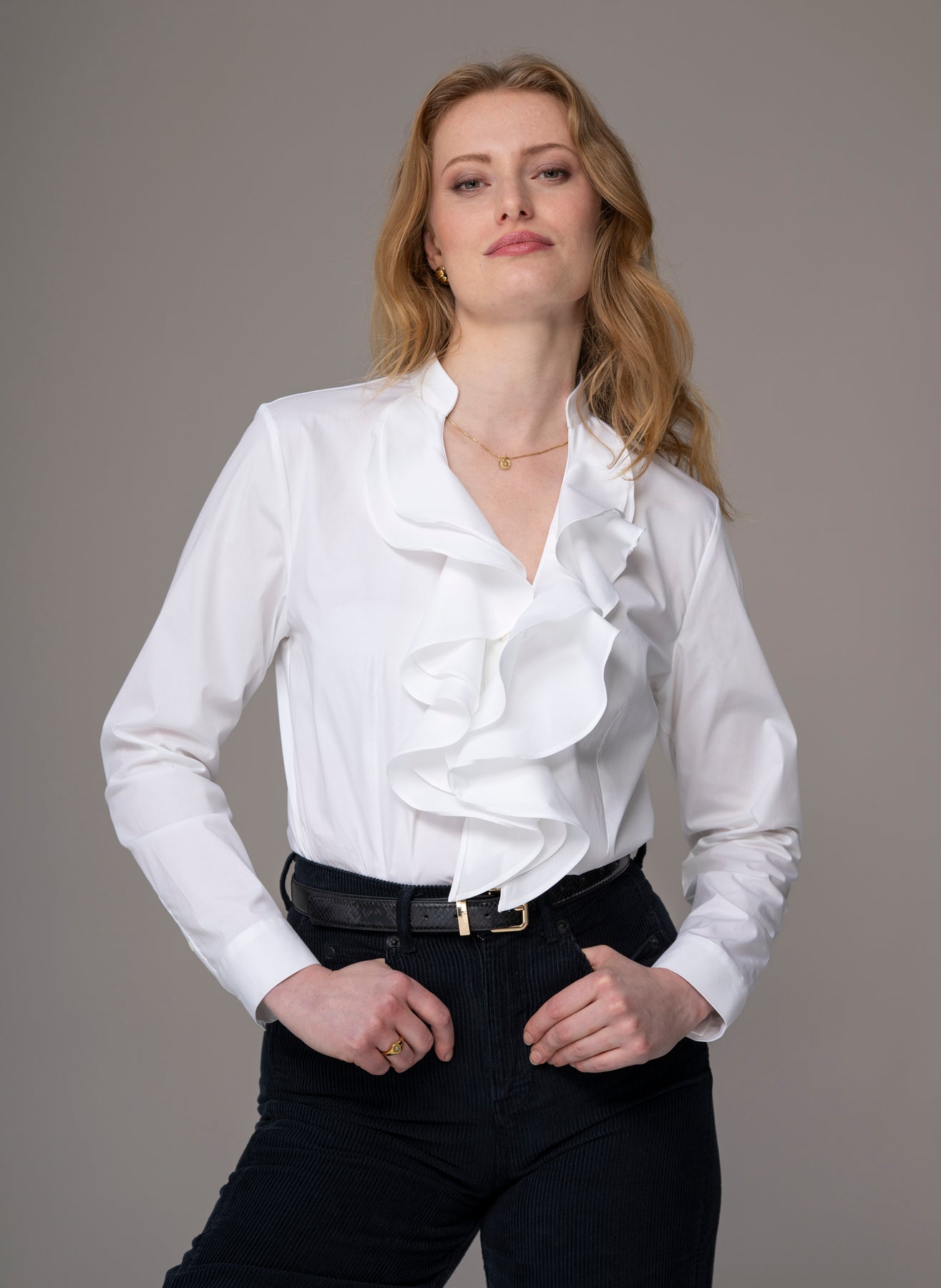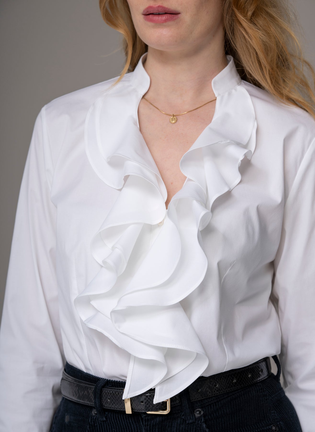 Cecile Ruffle Front Tailored Shirt in White Cotton Poplin