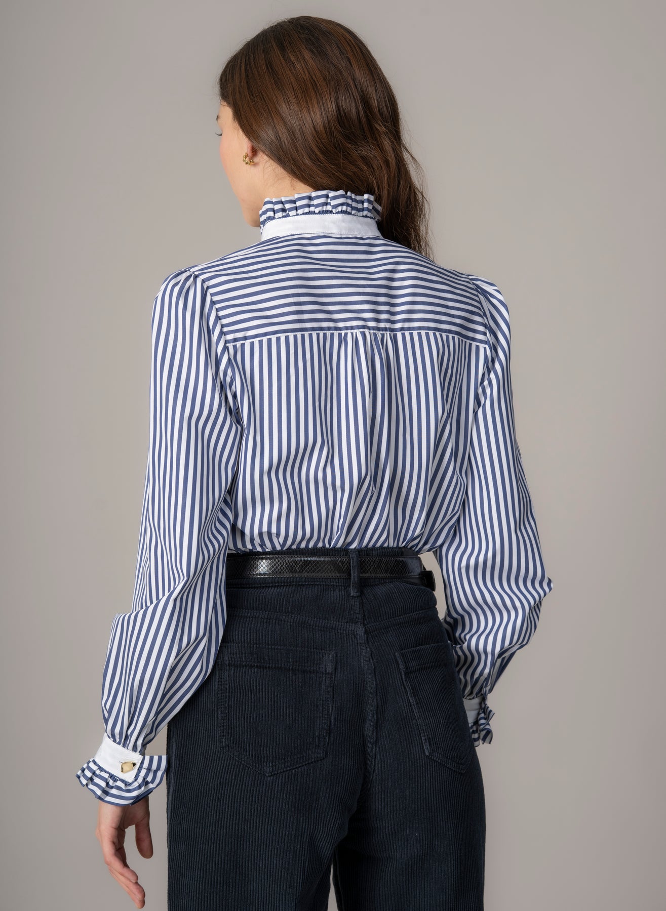 Kristen Navy & White Stripe Frill Collar Shirt with Grosgrain Trim