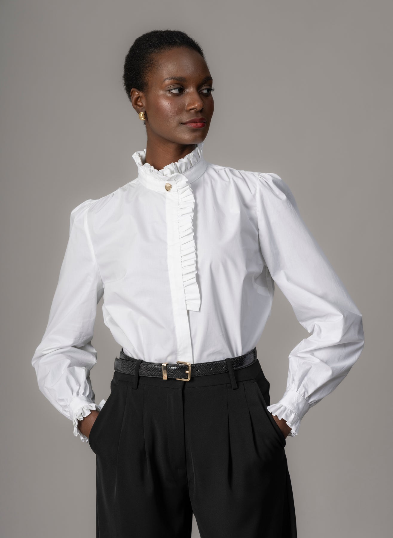 True to the DNA of The Shirt Company, Kristen takes classic shirting and elevates it with feminine detailing - delicate frills, sleek grosgrain tape, and gleaming gold nugget buttons. Crafted in crisp, high-quality cotton poplin, it offers a polished silhouette that feels both modern and effortlessly cool.